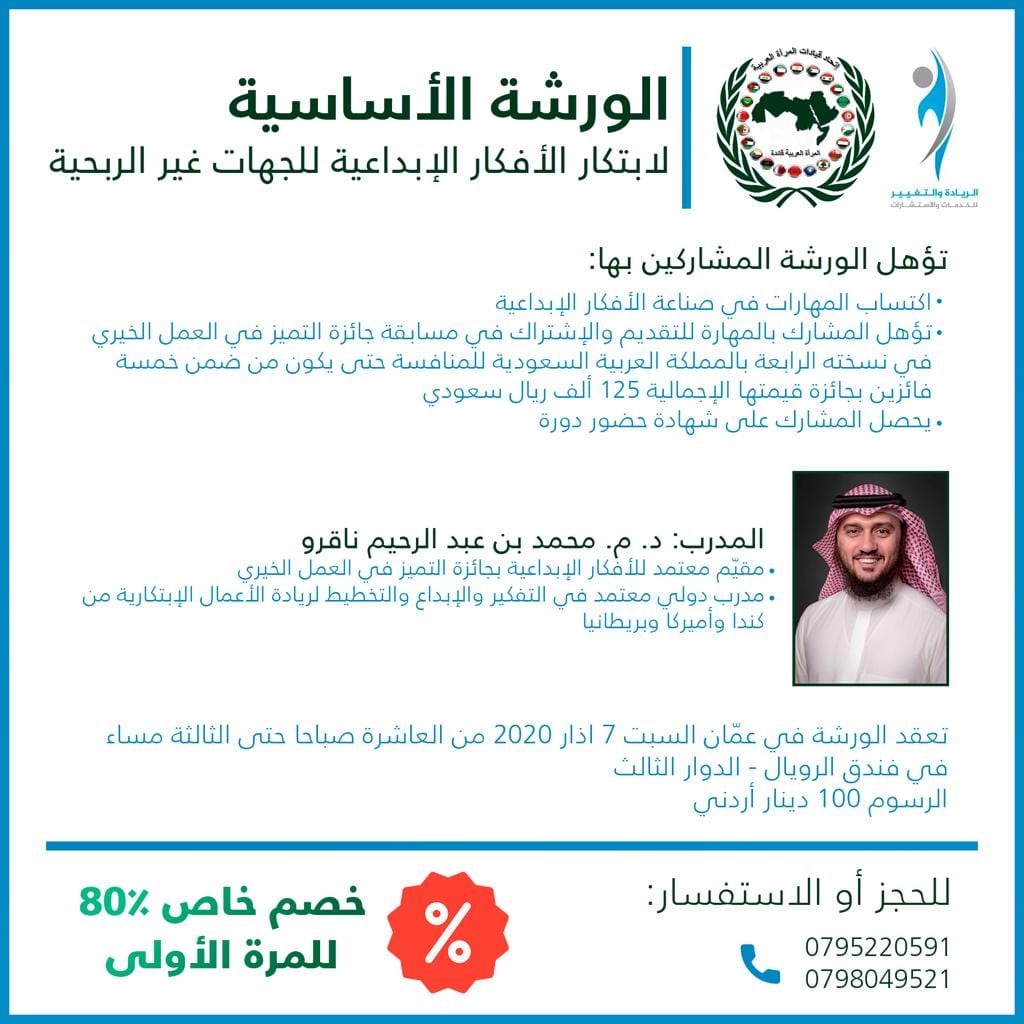 يعلن إتحاد قيادات المرأة العربية وممثليه في الاردن عن عقد ورشة تدريبية بالتعاون مع المدرب الدولي الدكتور محمد بن عبد الرحيم ناقرو تحت عنوان الورشة الأساسية لإبتكار الأفكار الإبداعية للجهات