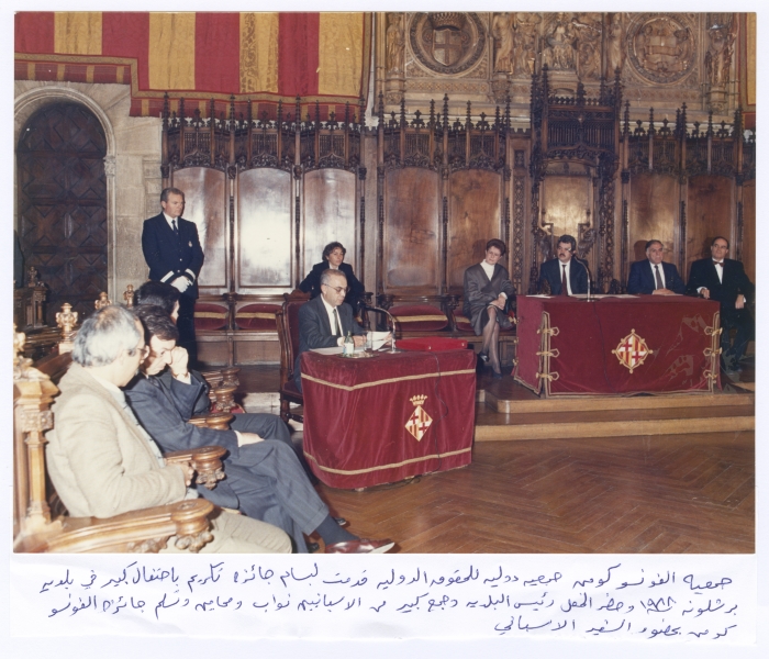 رئيس بلدية نابلس أثناء تسلمه جائزة جمعية حقوق الانسان العالمية الاسبانية The Palestinian Museum Digital Archive Pmda