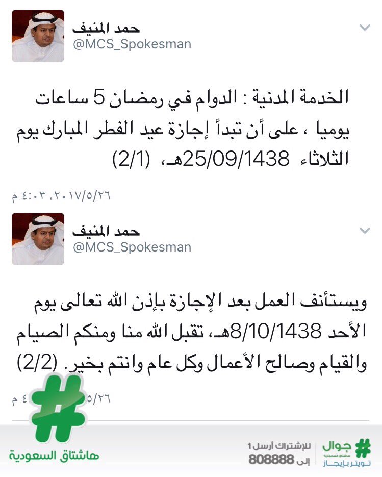 هاشتاق السعودية On Twitter الخدمة المدنية الدوام في رمضان 5 ساعات يومي ا وتبدأ إجازة عيد الفطر يوم الثلاثاء 1438 9 25هـ ويستأنف العمل يوم الأحد 1438 10 8هـ Https T Co Chtyuryuja